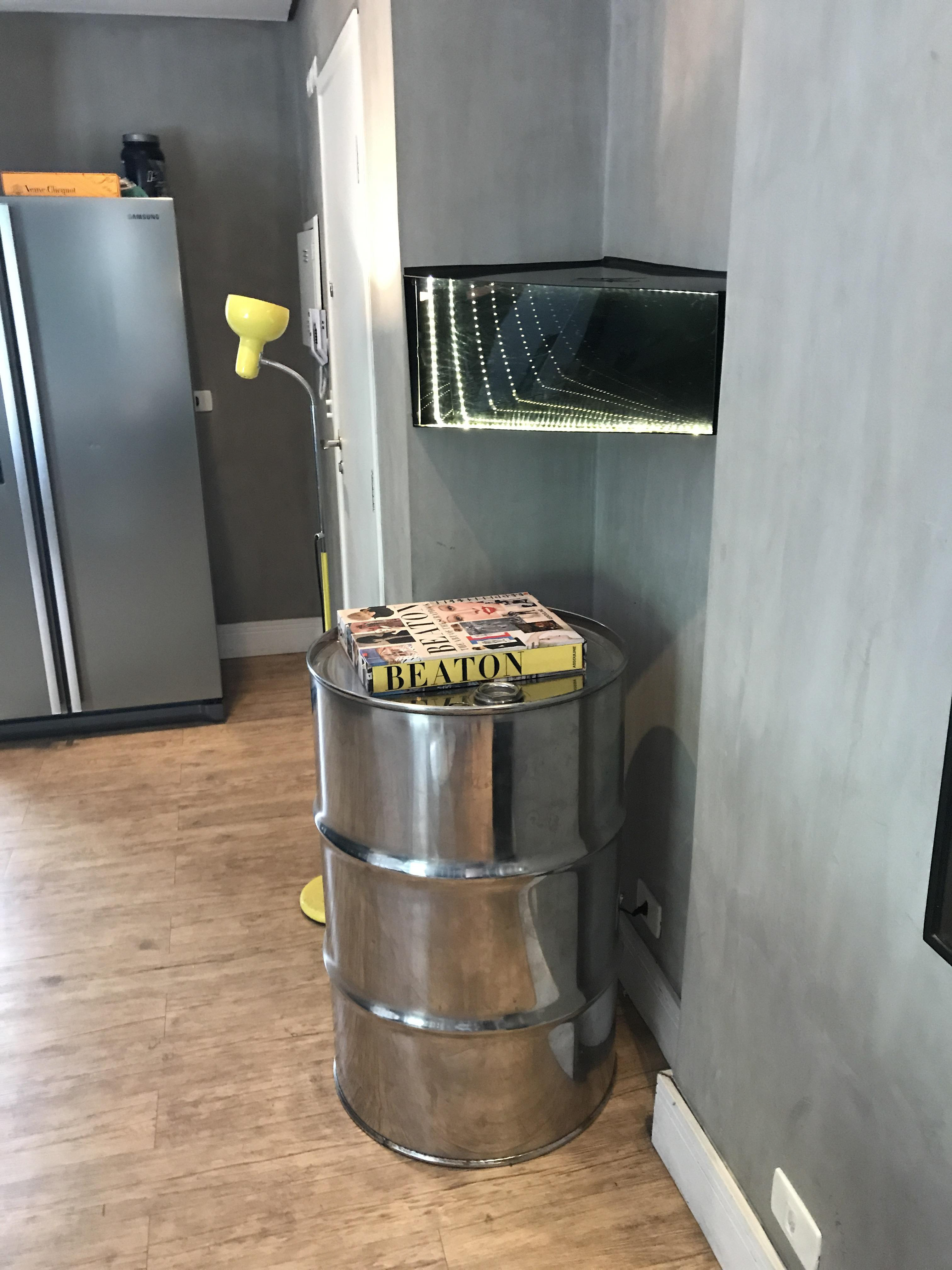 This was made especially for this wall corner of my client's house. After measuring the sides, I picked a warmer light and a darker shade for the mirror, to match his existing decor.